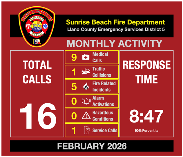 The Department responded to 16 calls for service in February, including a fatal motor vehicle collision on Ranch Road 2900 that claimed two lives and seriously injured two others. The two injured individuals were transported by air ambulance to an area hospital. Ranch Road 2900 has seen multiple serious collisions in recent years, and drivers are reminded to exercise caution, maintain safe speeds for conditions, and avoid distractions on this roadway.